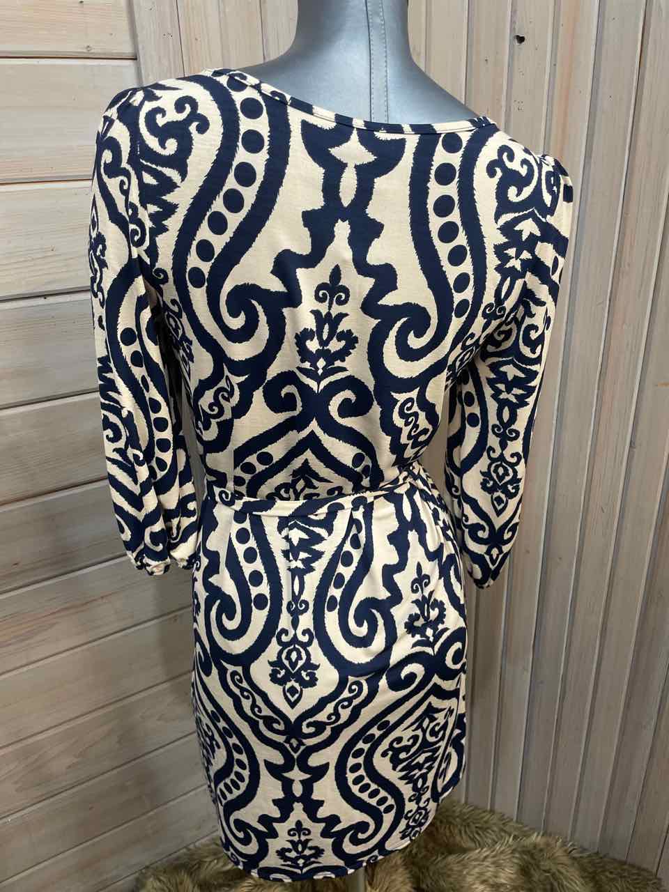 maternity navy & beige print elbow sleeve dress